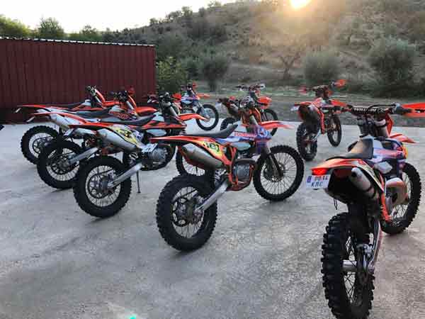 Es stehen zehn Enduros der Marke KTM 300 TPI, 350, 450 und 500 EXC’S zur Verfügung, die für Anfänger und erfahrene Fahrer geeignet sind. Alle Motorräder werden von Vollzeitmechanikern perfekt gewartet, so dass eine Einsatzfähigkeit zu jeder Zeit gewährleistet ist.